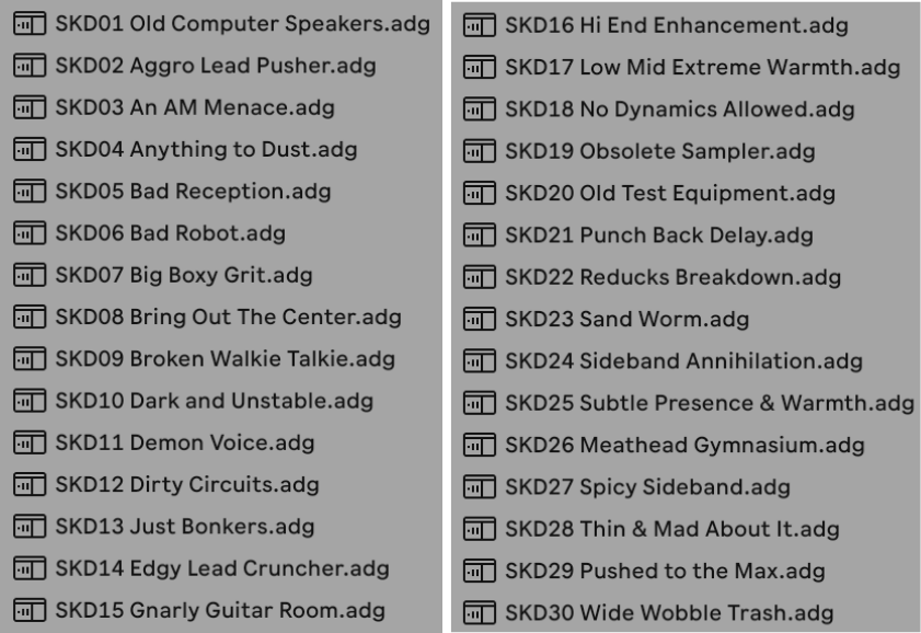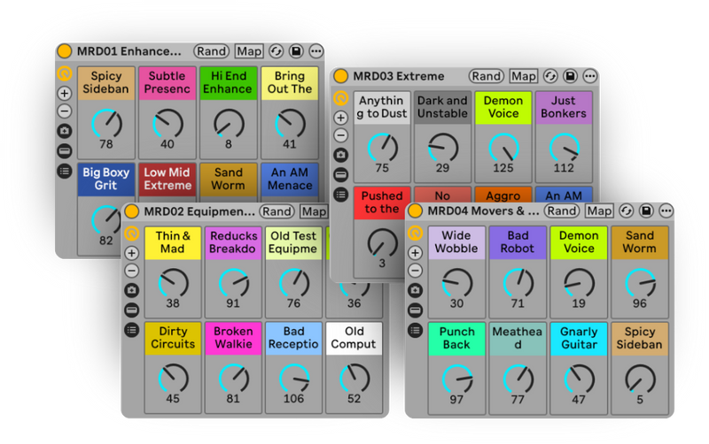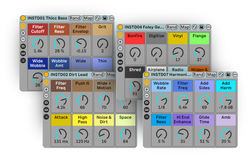 8 professionally designed Ableton Instrument racks. Basses, foley generators, leads, and more. Use in combination with the one-knob effects for even more unique sounds.